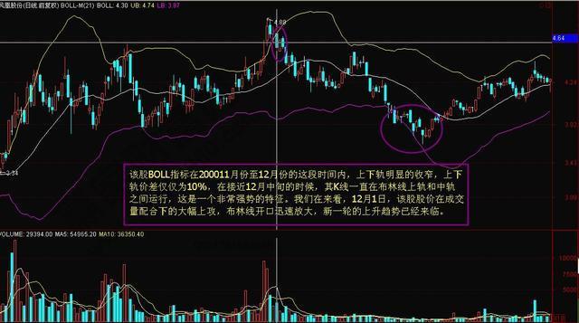 上 图是凤凰股份在2000年11月至2001年3月份的走势图,从图中我们可以看到,该股BOLL指标在200011月份至12月份的这段时间内,上下轨明 显的收窄,上下轨价差仅仅为10%,在接近12月中旬的时候,其K线一直在布林线上轨和中轨之间运行,这是一个非常强势的特征。我们在来看,12月1日, 该股股价在成交量配合下的大幅上攻,布林线开口迅速放大,新一轮的上升趋势已经来临。