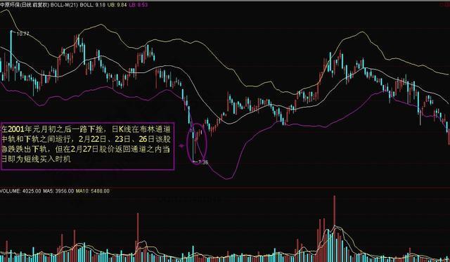 上 图是该股在2001年1月至2月份的走势图,从上图中我们可以看到该股在2001年元月初之后一路下挫,日K线在布林通道中轨和下轨之间运行,2月22 日、23日、26日该股急跌跌出下轨,但在2月27日股价返回通道之内当日即为短线买入时机,时价为8.50元,其后股价在很短的时间内上升到10元附 近,获利近20%。