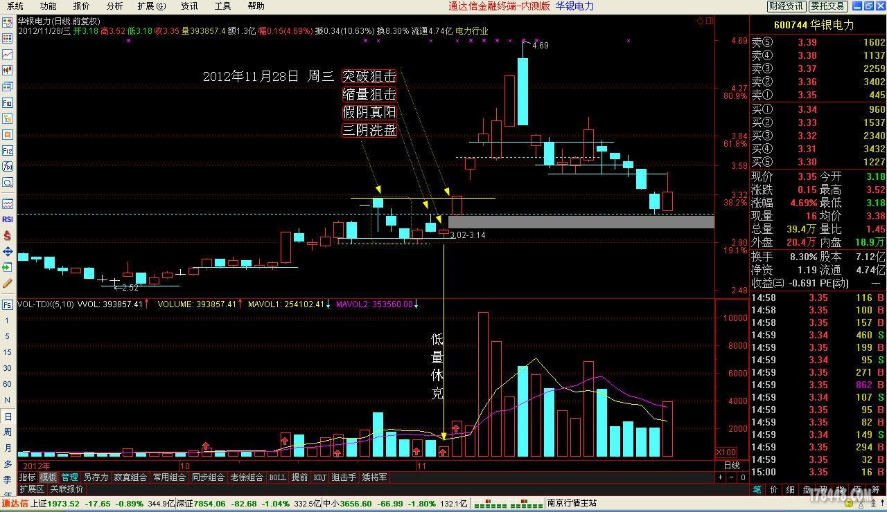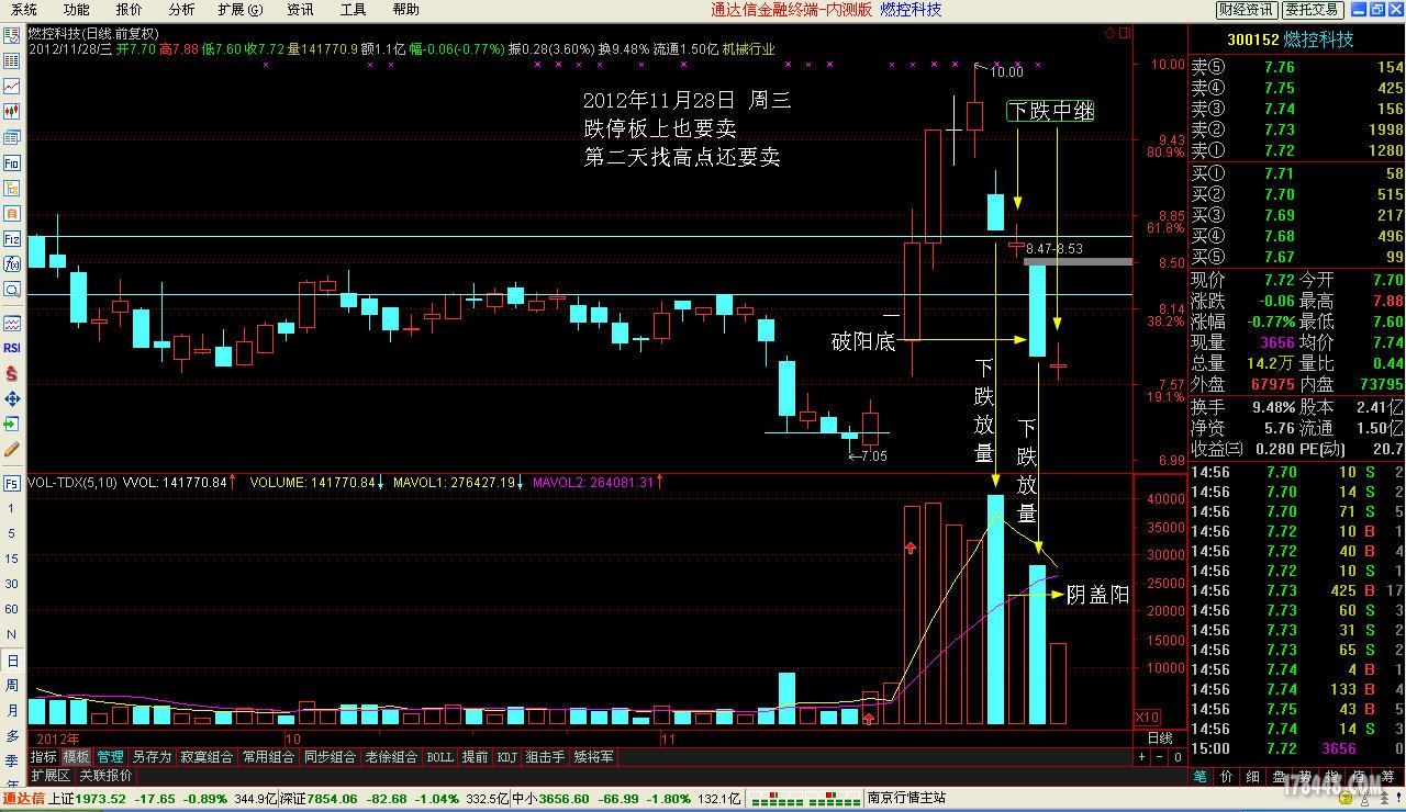 11月23日是巨量阴柱阴线,后面拉涨停该抢,抢了第二天低开,只要是低开都不大好,低开后回拉不到昨天的收盘价,就是中轴线,二波拉不上去就结束了,下打时你要拼命的跑,来不及就在跌停上挂单。参加过特训班的全学过,闪电买入闪电卖出挂单,因为这种股一定要高挂,要不计成本的出来,不出来明天还有个下跌的惯性,别指望它还能回来,先走了再说,保住你的本金,以后总是有机会的。