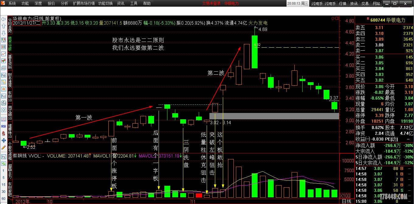 追什么样的涨停板?底部的第一个板不追,最好的二个位置你要追:一是洗盘结束时的涨停板,赶在封停时敢于往里追。二是有异动的,有二种:一是有巨量阳突破最高点时可以追,还有是异动巨量阴(华银电力10月29日),洗完盘了过顶就敢追。你只追这二个位置,别的就不要追了。特别是底部第一个板不要追,你要看清楚什么样的位置才可追?所以一定要记住这二个位置。