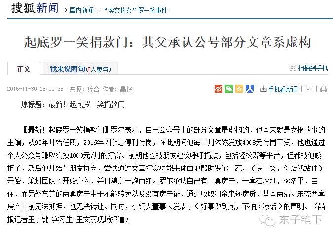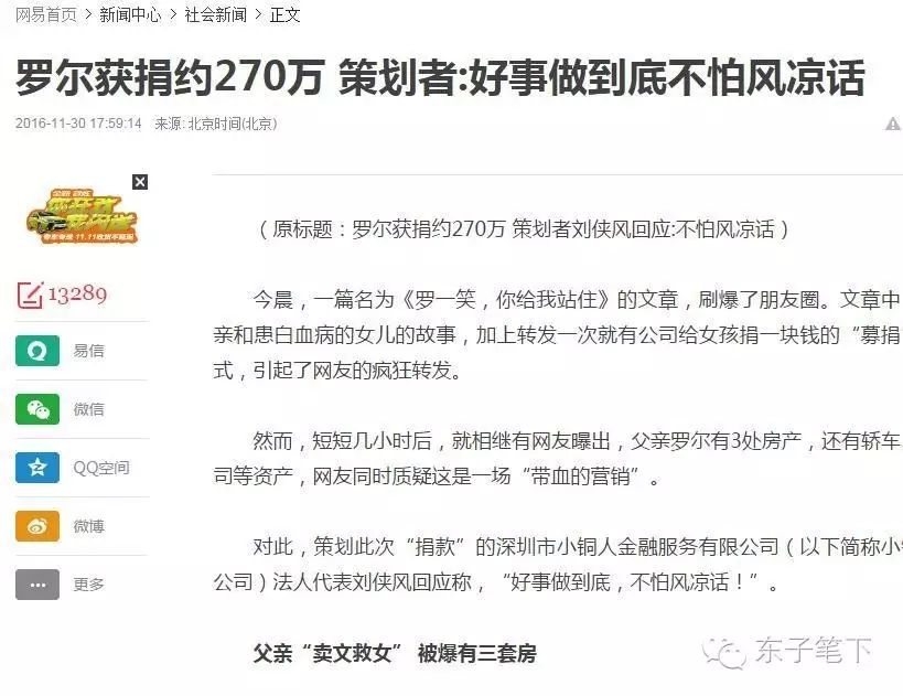 昨天上午10点半在朋友圈发现此事,我没有向大多数“糊涂蛋”一样盲目转发,而是经过理性调查了解后,于当日12点写出《你的善良被罗一笑她爹给涮了,别再转发了!》,到今晨,此文已被转发、阅读5000多次。