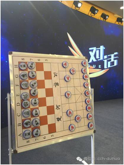 这个棋盘一分为二,一半排列着熟悉的“车马炮将象卒”,另一半却是有些陌生黑白格“王后车象马兵”。主持人解释称:“这个中外‘双拼’棋盘其实对应的中国企业家海内外两个战场。”