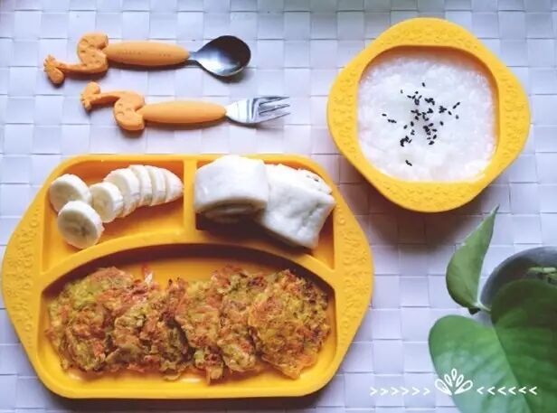 午餐的时候,做一份富含钙和维生素的虾仁蔬菜饼,配上白米粥、小葱卷,再加上香蕉,孩子一天所需的碳水化合物、矿物质和维生素都满足了!
