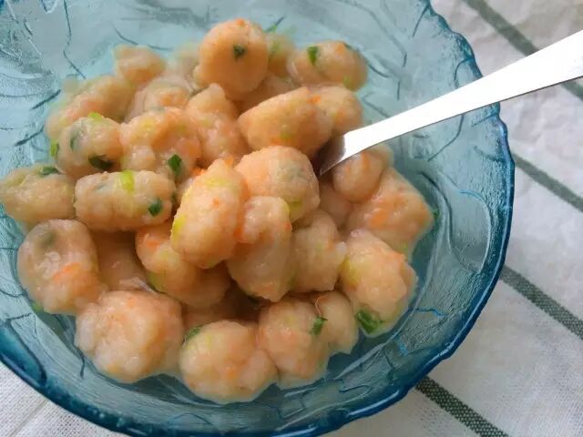 准备:鲜虾、胡萝卜、西葫芦、鸡蛋(只取蛋清)、淀粉、香葱、盐、芝麻油各适量。