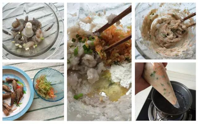 ① 虾去头去壳去虾线,放入料理机或者绞肉机,加一些葱白,打成虾泥,打不成泥可以加一点蛋清。