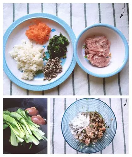 ① 香菇、青菜洗净下锅焯水后,挤掉水分切碎。