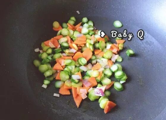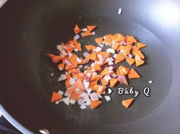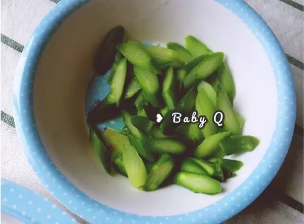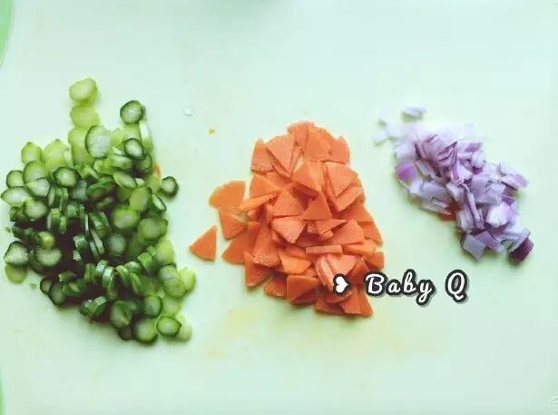 芦笋切片,洋葱切丁,胡萝卜切小片,根据宝宝的咀嚼能力调整性状。