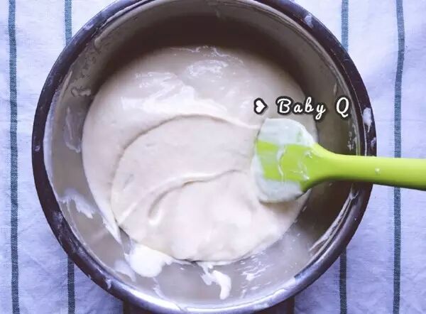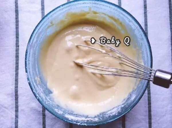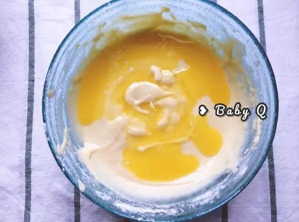先把1/3蛋白糊倒入蛋黄糊搅拌均匀,再倒回蛋白糊搅拌。