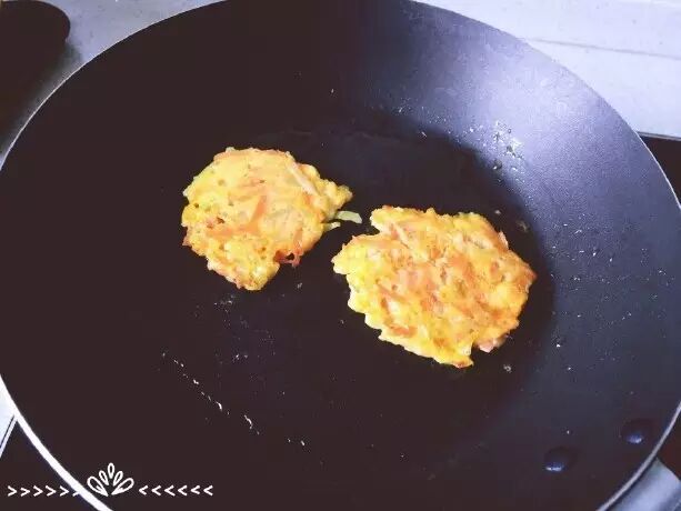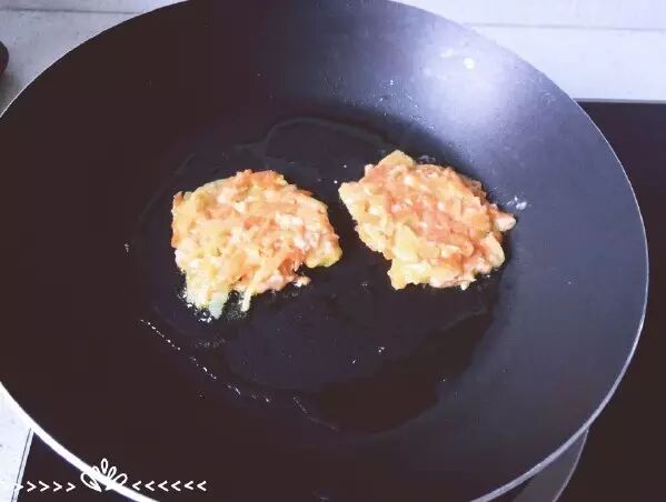 平底锅放少许油,舀一勺面糊,用勺子压平。