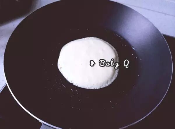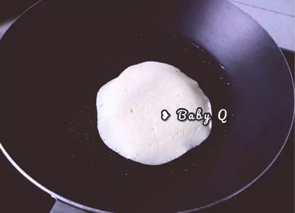 平底锅抹一点油,倒入一勺面糊,转动锅,让面糊摊圆。