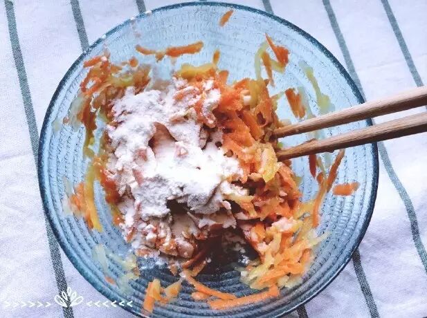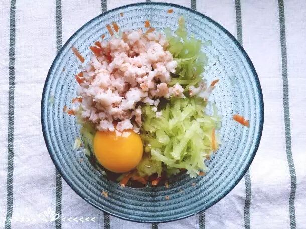 胡萝卜、莴笋擦丝,虾剁碎,加入鸡蛋。