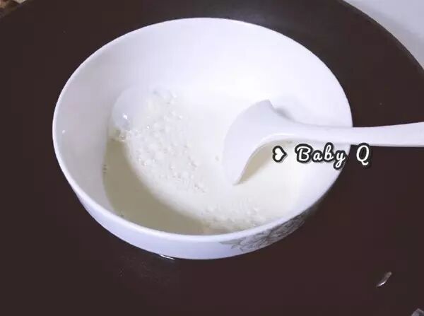 准备一个锅,倒上热水,糖加一部分牛奶倒入碗里,隔水搅拌让糖融化。