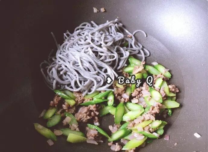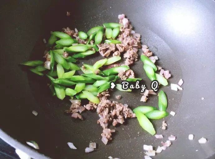 最后放入芦笋,翻炒好后均匀铺平在锅底。