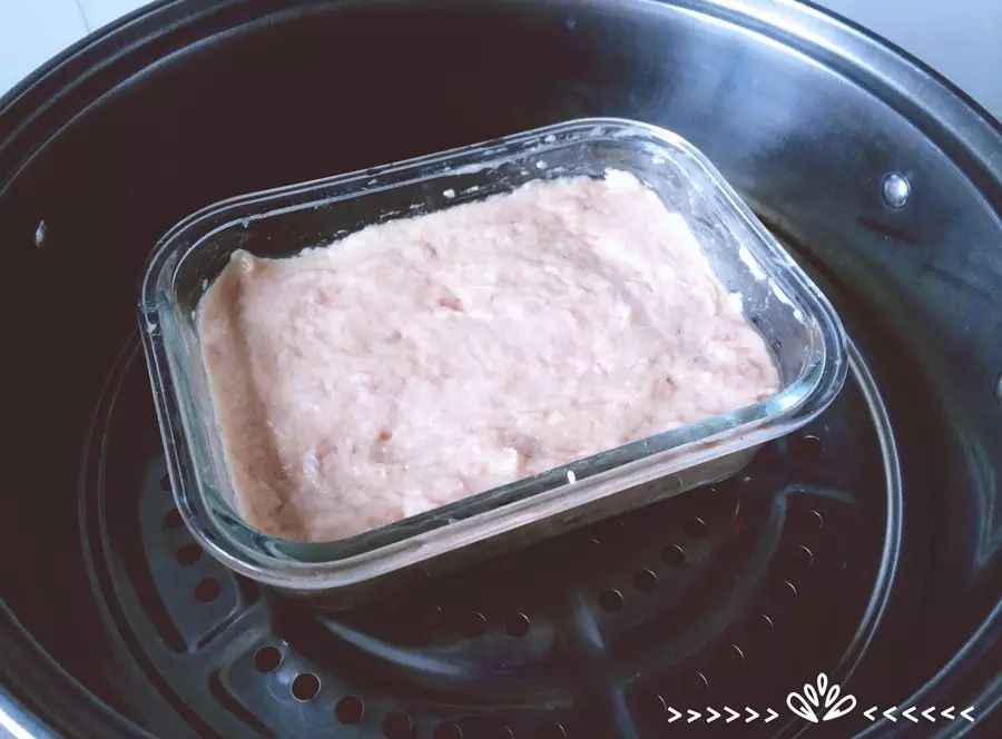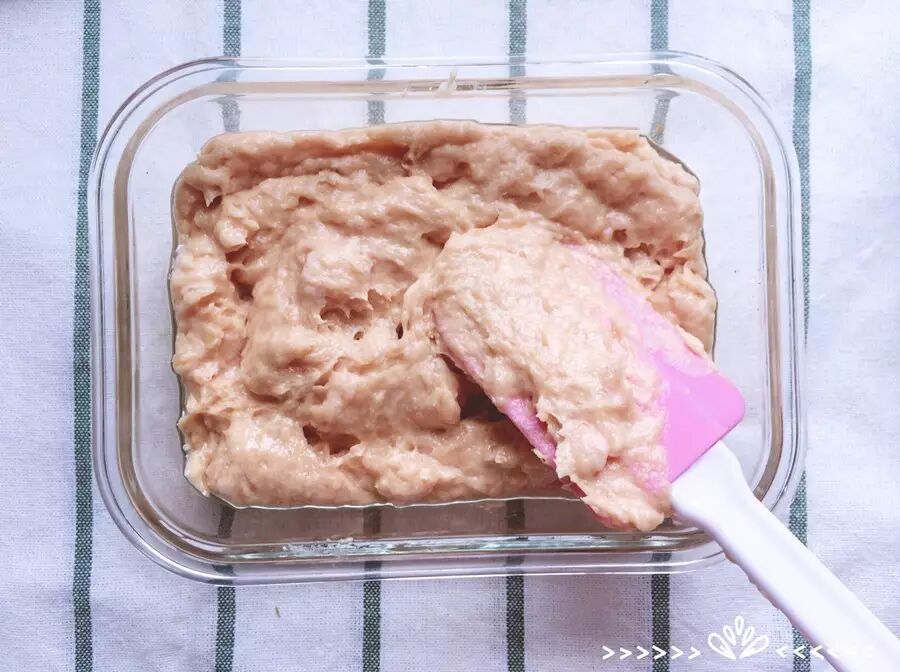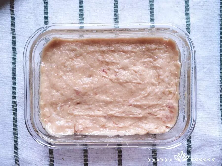 容器抹油,把肉泥放进去,一边放一边用刮刀切,让肉更紧实。