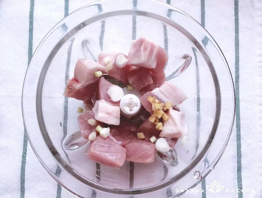 猪肉切小块,加入葱姜入绞肉机,绞不动加少许水。