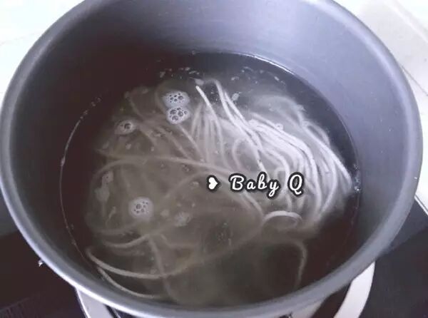 黑芝麻面煮至9分熟,捞出冲冷水备用。