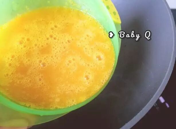 鸡蛋加少许盐和虾皮粉打散,沿着锅边倒入。