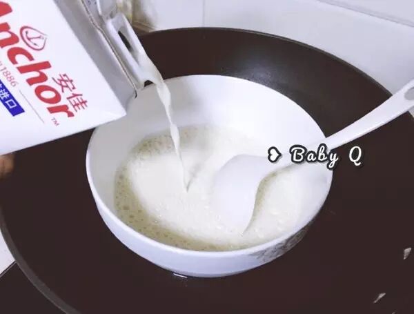 糖全部溶化后倒入剩余的牛奶,搅拌一下。