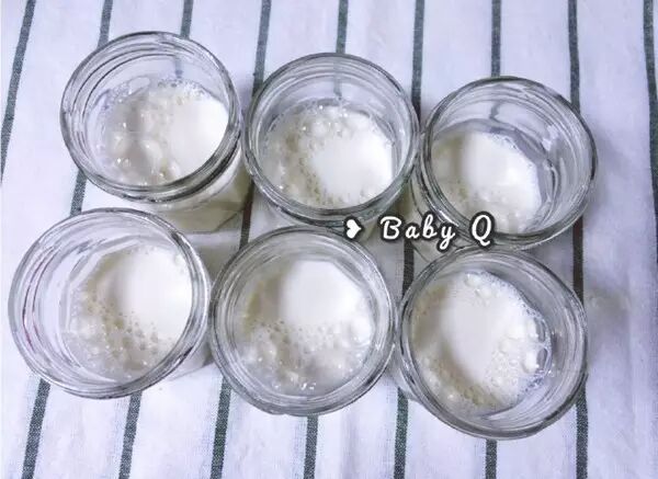 准备好消过毒的玻璃瓶,晾干水分。倒牛奶前继续搅拌,然后每个瓶子里先装一半,接着再装另一半,防止菌粉没有融化均匀。