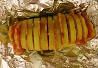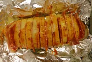 准备:土豆两个,培根、烤肉酱、黑胡椒碎、植物油适量,锡纸两张。