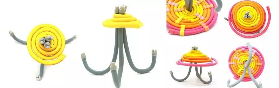 ② 三根长度相同的扭扭棒做桌子腿同时连接着桌面,扭扭棒顺着一个方向盘成圆,把桌子腿捆绑住固定中心,要是认为桌面小可以连接扭扭棒继续盘,最后用零件三排扣加固桌面。