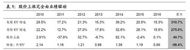 11-16年中国平安的估值一直在1EV上下浮动,长达5年的市场定价,意味着,1EV买入,尽管估值没有变化,每年也可以获得百分20的回报。因为EV的平均增速是百分20。(考虑融资后)。