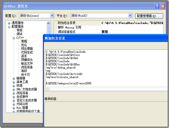 2. 右键项目属性,设置相关属性,附加保护目录里面添加C:\Qt\4.5.0\winDbus\include