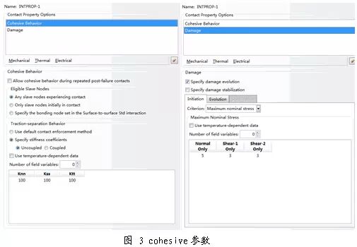 每层复合材料之间建立接触,接触属性为cohesive接触属性,参数如图 3所示,