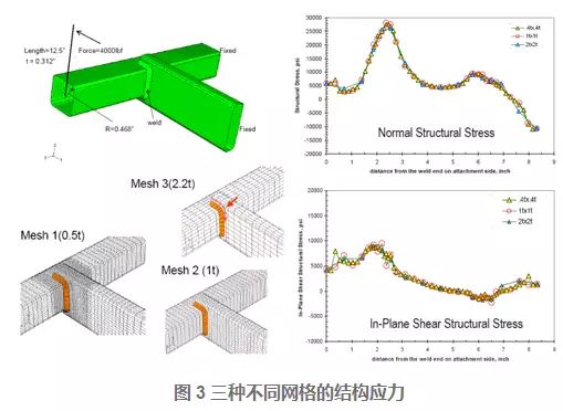 对于如图3所示的焊接结构模型,不同单元尺寸(分别为0.5t*0.5t,1.0t*1.0t,2.0t*2.0t)的有限元结果转化的结构应力(Structural Stress)结果沿焊缝线基本一致,这说明结构应力(Structural Stress)对于有限元模型的单元尺寸不敏感。