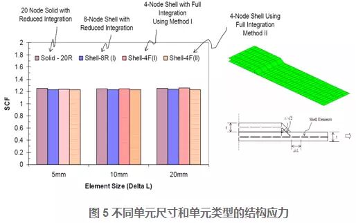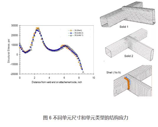 对于如图6所示的焊接结构模型,不同单元尺寸的实体单元和壳单元的有限元模型应力转化的结构应力(Structural Stress)结果如下图所示,这说明结构应力(Structural Stress)对于有限元模型的单元尺寸和单元类型不敏感。