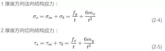 由如上公式计算出焊缝处的线力和线力矩后,通过材料力学的简单梁公式计算膜正应力和弯曲正应力: