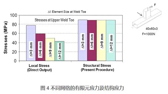 对于如图4所示的焊接结构模型,不同单元尺寸的有限元模型计算得到的应力及转化的结构应力(Structural Stress)结果如下图所示,这说明焊趾处的应力随网格尺寸变化很敏感,而结构应力(Structural Stress)对于有限元模型的单元尺寸不敏感。