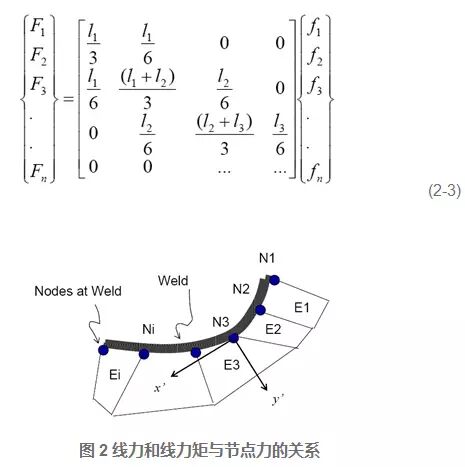 节点力法结构应力的计算原理: 组成结构应力的膜正应力分量和弯曲正应力分量分别由作用在其板厚截面上的轴向线力F和线力矩M导致,而轴向线力和线力矩是由有限元方法计算得到的节点力计算得到,如图2所示;其中轴向线力与节点力的平衡方程如下:
