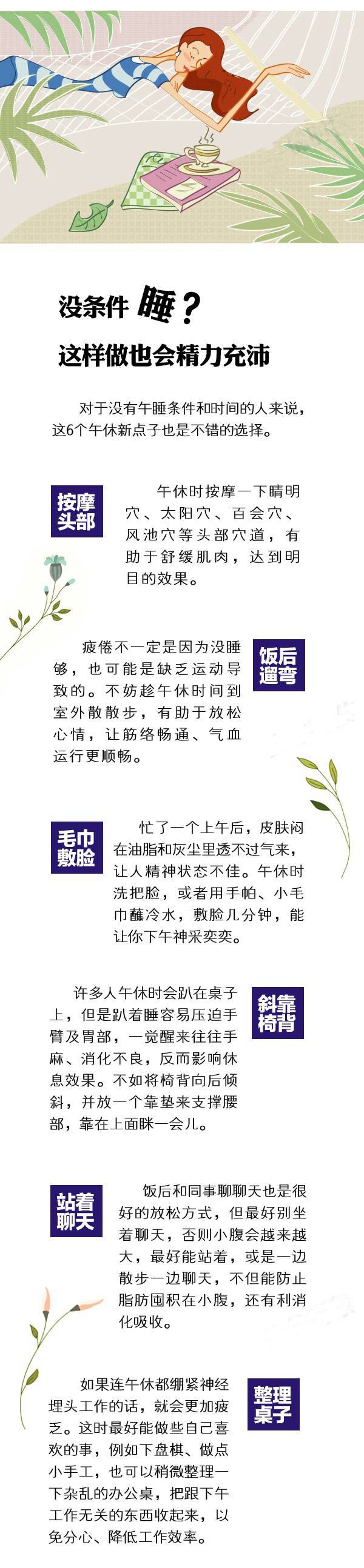 工作了一上午,你是不是已经感到昏昏沉沉,脑子明显不够用了?此时,你最需要做的,就是放下手中的工作小睡一会。其实,睡午觉也是个技术活儿。美国宾夕法尼亚大学睡眠研究科学家大卫•丁吉思博士等多位专家建议,为您总结一份“完美午睡须知”。