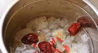 银耳最好先在水中泡15分钟,选材不要超级白的银耳,银耳不是约白越好,把所有的辅料都丢进锅里就好了。