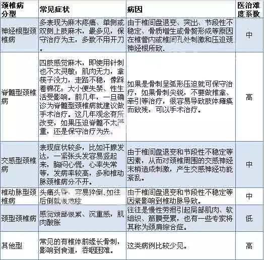 看了以上表格后,相信你能从症状初步判断自己是属于哪一颈椎分型,因颈椎病的发病因素较为复杂,建议去正规医院的骨科或康复科通过医生临床诊断及影像学资料,明确病因再做对应的治疗。