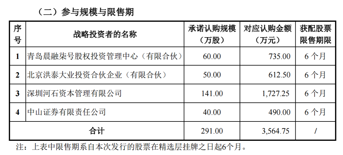 3、4家战投认购291万股。其中,青岛晨融柒号股权投资管理中心(有限合伙)拟认购60万股,北京洪泰大业投资合伙企业(有限合伙)拟认购50万股,深圳河石资本管理有限公司拟认购141万股,中山证券有限责任公司拟认购40万股。
