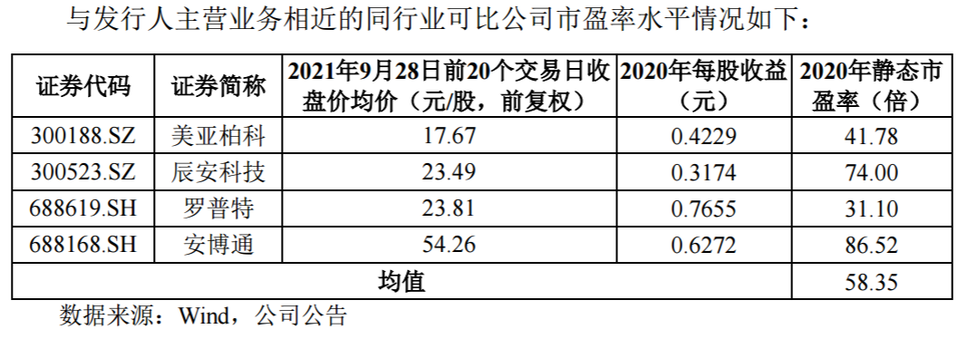 上述同行业可比公司2020年静态市盈率均值为58.35倍。公司主要产品广道移动终端静默采集系统为信息前端采集设备,市场参与者较多,且每个参与者的 市场占有率均不高,公司为该产品市场主要参与者。主要竞争对手为美亚柏科、辰安科技、数字政通、武汉虹旭信息技术有限公司、北京锐安科技有限公司、北京博艺网讯科技有限公司、南京烽火星空通信 发展有限公司、任子行网络技术股份有限公司、重庆爱思网络信息技术有限公司、上海新网程信息技术股份有限公司及北京码牛科技有限公司等。