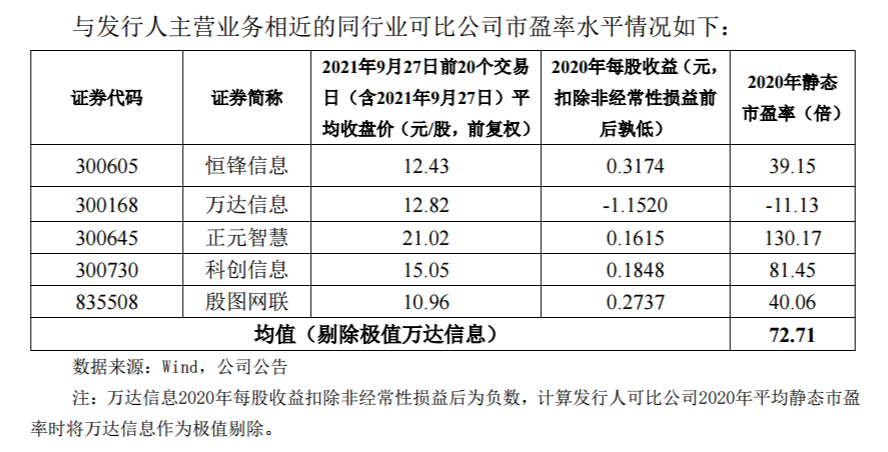 按照中国证监会发布的《上市公司分类与代码》(2012年修订)的行业目 录及分类原则,公司所处行业为“I信息传输、软件和信息技术服务业”中的“I65软件和信息技术服务业”。截至2021年9月27日,中证指数有限公司发布的“I65软件和信息技术服务业”最近一个月平均静态市盈率为58.23倍。本次发行价格5.80元/股,对应未行使超额配售选择权时,发行人对应的2020年扣除非经常性 损益前后孰低净利润摊薄后市盈率为16.14倍;假设全额行使超额配售选择权时, 发行人对应的2020年扣除非经常性损益前后孰低净利润摊薄后市盈率为16.50倍,均低于行业最近一个月平均静态市盈率。
