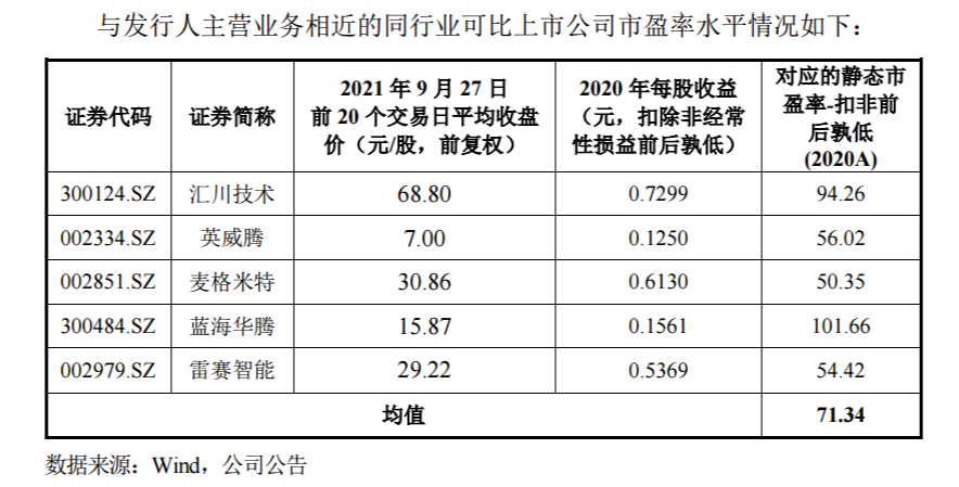 这5家公司都在深圳,业绩大部分还不错,工业自动化也是出牛股的地方,高瓴资本还定增参与了汇川技术。海希通讯招股书说,同行业可比上市公司 2020 年静态 市盈率均值为 71.34 倍。其实这个数值被夸大了,以上五家动态市盈率平均只有38.6倍,静态市盈率也不过50倍。这还是汇川技术高估值拉动的,中小公司估值大多只有30多倍。
