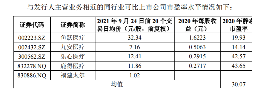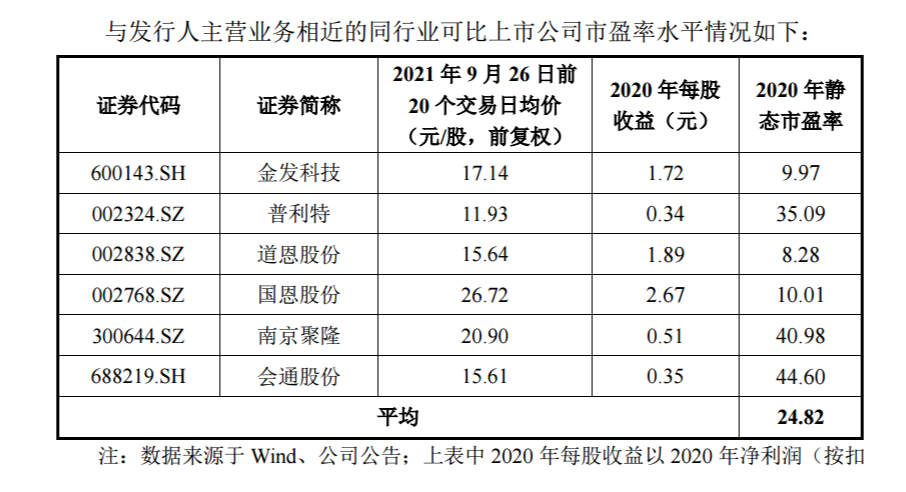 以2021年9月24日前20个交易日(含2021年9月24日)的均价(前复 权)及最新股本摊薄的 2020 年每股收益(2020 年净利润按扣除非经常性损益前 后孰低计算)计算,上述同行业可比上市公司 2020 年静态市盈率均值为 32.57 倍。