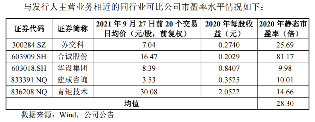 上述同行业可比公司 2020 年静态市盈率均值为 28.30 倍。广咨国际本次发行价格 14元,对应未行使超额配售选择权时,2020 年市盈率为17.72 倍。