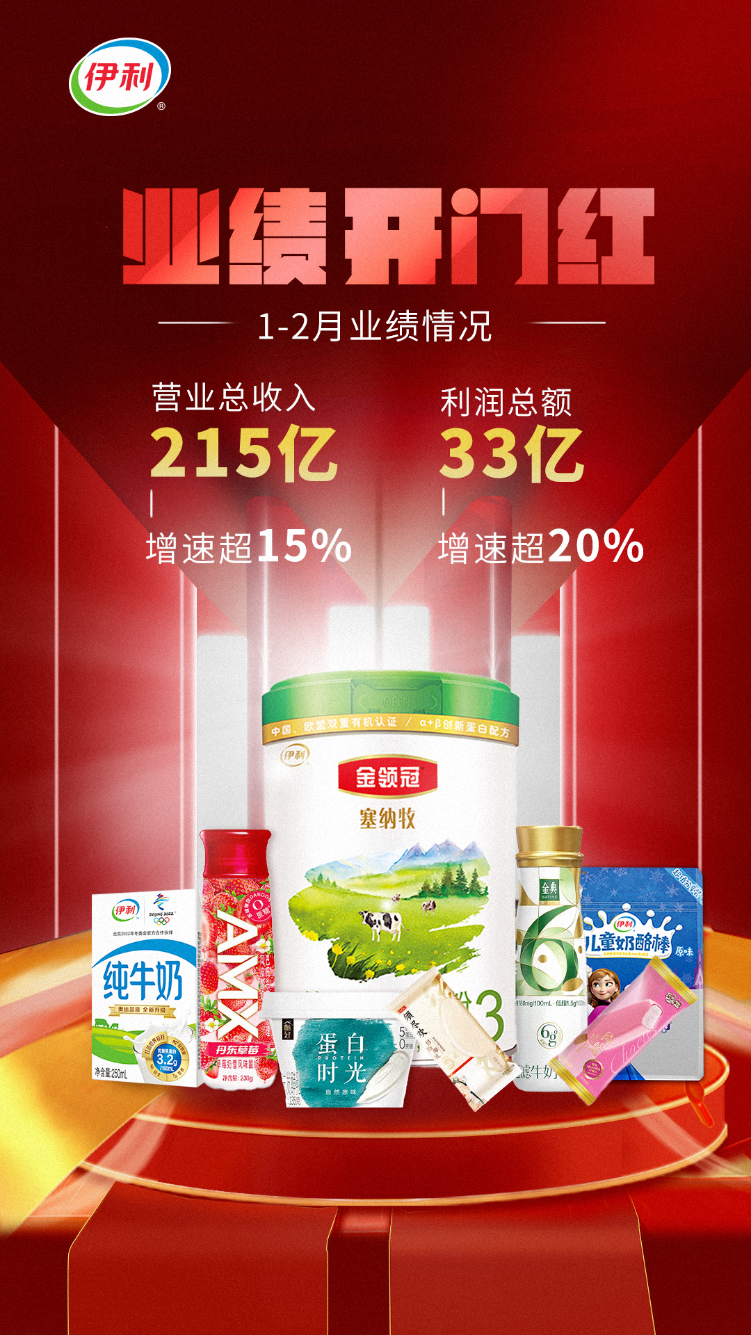 随着金领冠婴幼儿配方奶粉快速崛起,奶酪业务翻倍增长,伊利全面构筑第二增长曲线。1至2月金领冠销售收入同比增长30%以上,增速位列行业首位。