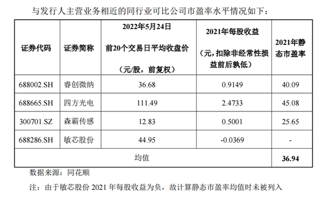 以 2022 年 5 月 24 日前 20 个交易日(含 2022 年 5 月 24 日)的均价(前复 权)及最新股本摊薄的 2021 年每股收益(2021 年净利润按扣除非经常性损益前 后孰低计算)计算,上述同行业可比公司 2021 年静态市盈率均值为36.94 倍。