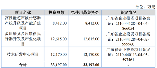 公司本次拟公开发行不超过 3,600 万股人民币普通股,占发行后总股本的 24.6820%。公司拟募资约3.3亿元,用于高性能超声波传感器产线升级及产能扩建项目等。本次IPO,奥迪威计划将募集资金的8412万元投入传感器产能升级和扩建,12615万元投入执行器的开发和产业化项目。本次奥迪威的募投项目中传感器产线升级及产能扩建项目完全达产后,将新增高性能超声波传感器产能6160万只/年,较2021年产能扩产比例为106.18%。