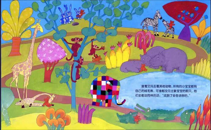 当然,一(6)班的孩子好聪明,他们一下子猜到了是谁。我灵机一动,说:“小象没有泰迪熊会睡不着觉,泰迪熊好像也不能离开小象。就像我们小朋友喜欢花格子大象艾玛,艾玛一定在把自己弄丢在什么地方,你们说它走丢了会怎么样?”