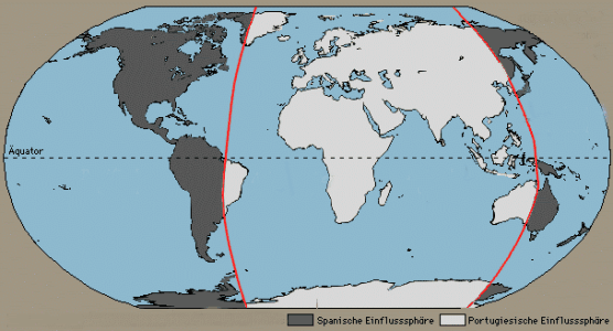 至于大西洋方向,葡萄牙“以退为进”默许西班牙在亚洲殖民今菲律宾,换取西班牙对葡萄牙控制今巴西的“无视”。并强调在此之后双方严格遵守1494年6月7日葡西两国的《托德西利亚斯条约》,以佛得角群岛以西2200海里处的“教皇子午线”为界“和平瓜分世界”。