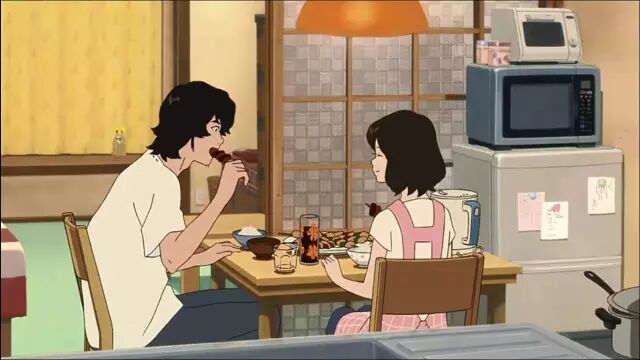 《狼的孩子雨和雪》(2012)中,在国立大学读书的花(宫崎葵 配音)得知来校旁听的温柔男子(大泽隆夫 配音)是一名狼人,依旧义无反顾地和他坠入爱河并组成家庭;