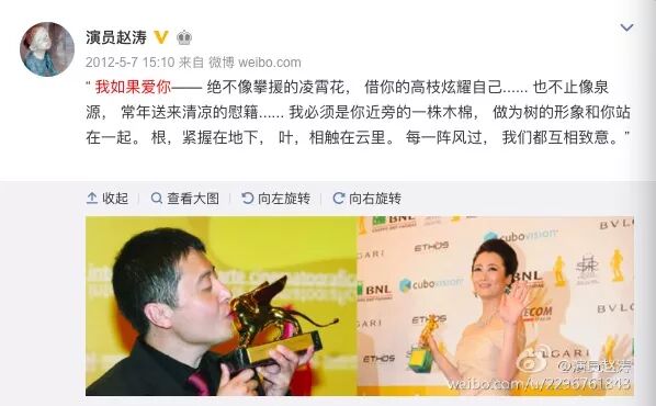 2012年赵涛凭借《我是丽》获得意大利电影大卫奖最佳女主角,成为首位获得此奖项的亚洲演员。之后,她在微博摘录了这段《致橡树》,并配图贾樟柯亲吻金狮和自己手握金像奖的照片。