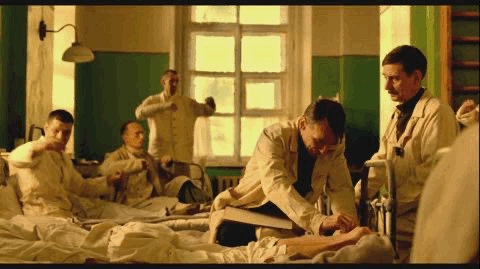 战后医院中荒诞的事情还有很多,炸弹的戕害让一位高位瘫痪的士兵向院长求死,本该救死扶伤的院长动了恻隐之心,答应在睡梦中让他无痛苦的离开。